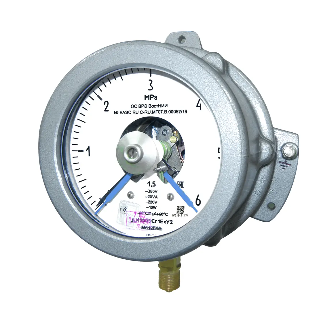 Манометры, вакуумметры и мановакуумметры показывающие сигнализирующие взрывозащищённые ДМ2005Сг1Ех, ДВ2005Сг1Ех и ДА2005Сг1Ех предназначены для измерения избыточного давления неагрессивных сред и управления внешними электрическими цепями от сигнализирующего устройства прямого действия. Приборы являются взрывозащищенными с видом взрывозащиты "Взрывонепроницаемая оболочка" и имеют маркировку взрывозащиты - «1Ех d IIВ Т4 Gb» по ГОСТ 31610.0-2014 (IEC 60079-0:2011), ГОСТ IEC 60079-1-2011.